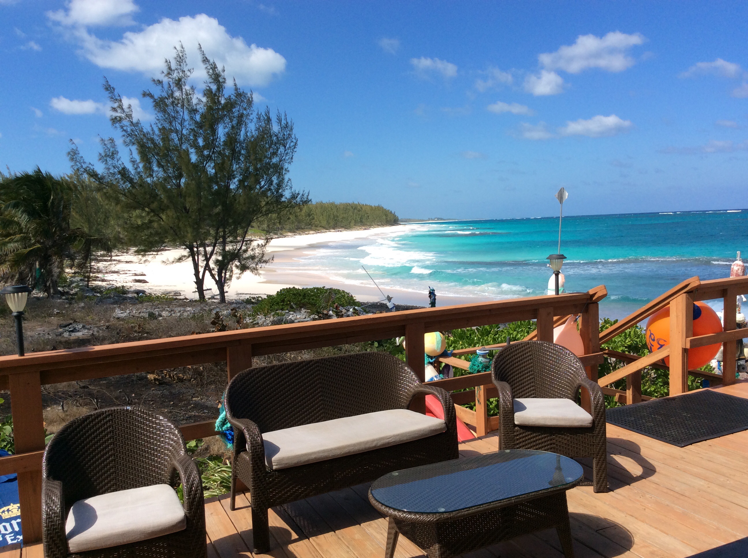 This morning we woke up to pretty stiff winds and couldn’t think about sailing, so we rented a car, along with a couple we met last night and we toured Eleuthera. Sunday’s are very quiet in the Bahamas, almost nothing open, but we found a couple of interesting spots. Governors Harbour is a lovely town and right outside it are 2 very interesting places. Our carpoolers have sailed Eleuthera many times and they wanted a hamburger from this guy that started selling them from a tent on the beach 4 years ago to a little cafe 3 years ago. We searched for the cafe and then asked a woman if she knew where it was. We tried to follow her directions, turned around a couple of times and finally found “the Deck”. The view from the deck is stunning…the decor is really beach kitsch done well. And, it was supposed to be the best hamburger and fries anywhere. We walk up and Mark, the owner says he’s closed because his worker didn’t show up. Mark is totally stoned, but then says he will fix us hamburgers and drinks. We agree on what we want, etc and then another couple comes up, but they were just having drinks. Mark went from a tent on the beach to a very impressive 18 acres on the beach and an incredible restaurant and home. We did have a great hamburger and fries and rum punch, and then for dessert, Mark wanted us to join him in smoking his cigar sized joint. We passed…on not smoking, but got a kick out of this character.